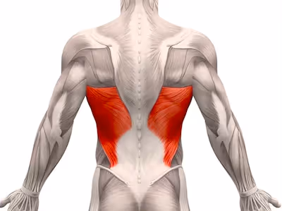 The bar is in front of you when setting up your shoulder press, but it is actually quite similar to the squat. Look how big your lats are and where they attach in your lower back (the red muscle in the photo). The white area your lats attach to is called your thoracolumbar fascia. By engaging your lats, you will create extra stability at your low back.